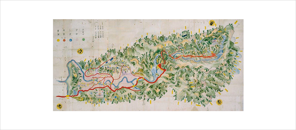 The painting is composed of the grounds of Shipporyuji Temple at the top (southeast) and the settlements of Ogi Village at the bottom. The expression of features around Shipporyuji Temple, such as ridgelines and waterfalls, is characteristically much more detailed than those of Ogi Village.
